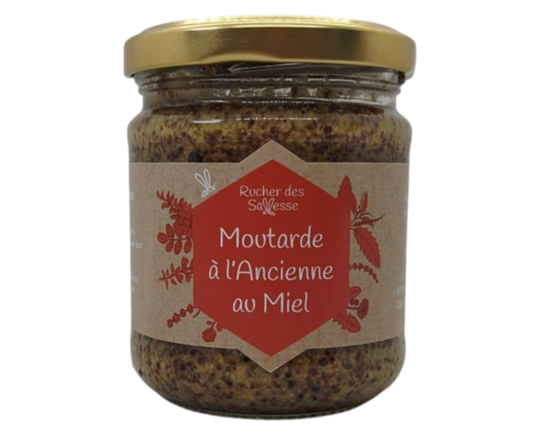 1 pot de 180gr de moutarde à l’ancienne au miel : une moutarde rustique, légèrement sucrée.